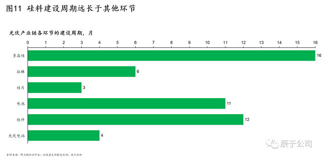 二是建設(shè)周期不同。硅料建設(shè)周期一般長達(dá)16個(gè)月,組件、電池、拉棒、光伏電站、硅片則分別為12、11、6、4、3個(gè)月,由于建設(shè)周期差異較大,供需錯(cuò)配的問題時(shí)有發(fā)生(見圖11)。