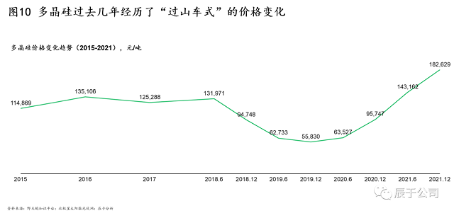 與此同時(shí),光伏產(chǎn)業(yè)鏈上各環(huán)節(jié)的價(jià)格波動(dòng)非常頻繁。以硅料為例, 2015-2018年6月,硅料價(jià)格基本維持在11-13萬元/噸的水平,然而2018年7月以后,由于嚴(yán)重的供大于求(預(yù)計(jì)硅料供給過剩規(guī)模35GW以上),硅料價(jià)格出現(xiàn)大幅下降,直至2019年12月觸及谷底5.6萬元/噸,之后隨之反彈,一路高歌猛進(jìn)到2021年底達(dá)到18萬元/噸。這種過山車式的價(jià)格波動(dòng)也導(dǎo)致硅料企業(yè)的盈利水平忽高忽低(見圖10)。