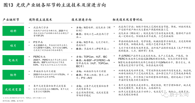往前看,技術(shù)迭代仍在快速推進(jìn),例如硅片就剛剛經(jīng)歷過P型單晶硅片替代多晶硅片的過程,其市場占有率從2016年的20%,短短四年間就提升至2020年底的90%以上;隨之而來的是,大尺寸的N型單晶硅片的概念又被提出,由于發(fā)電效率更高、終端產(chǎn)品的非硅成本(生產(chǎn)中所消耗的能源、人力、輔料等)更低,想必又將帶來新一輪產(chǎn)品迭代風(fēng)潮(見圖13)。