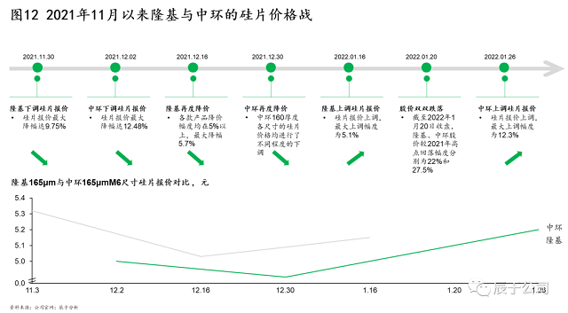 三是競爭壓力下的價(jià)格戰(zhàn)。2021年底以來,兩大硅片龍頭先后下調(diào)價(jià)格:2021年11月30日,隆基股份宣布下調(diào)硅片報(bào)價(jià),最大降幅達(dá)9.75%,兩天后,中環(huán)股份也宣布降價(jià),最大降幅達(dá)12.48%,而后雙方持續(xù)降價(jià)“硝煙四起”,直到2022年初,價(jià)格戰(zhàn)才見平息,雙方開始逐步回調(diào)硅片報(bào)價(jià)(見圖12)。