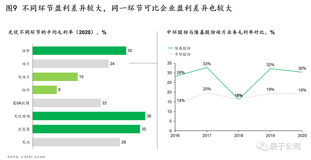 如前文所述,光伏產(chǎn)業(yè)鏈上下游之間相互博弈,這使得上下游各環(huán)節(jié)的盈利差異較大,例如2020年,硅料、光伏玻璃、逆變器等行業(yè)平均毛利率達(dá)30%以上,而電池片、組件這一數(shù)字分別僅為15%、8%。即使同一環(huán)節(jié),不同企業(yè)之間的盈利差異也較大:以硅片為例,除2018年以外,隆基股份的硅片毛利率均維持在28%以上的水平,比同期的中環(huán)股份高出10個(gè)百分點(diǎn)以上,據(jù)了解,造成這類差異的原因可能是中環(huán)股份的非硅成本、設(shè)備投資要高于隆基股份(見圖9)。