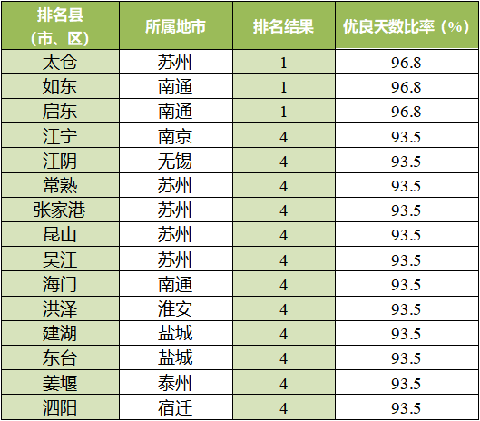 優(yōu)良天數(shù)比率相對(duì)較好的前10位(1-10名)依次是:太倉(cāng)(如東、啟東并列)、江寧(江陰、常熟、張家港、昆山、吳江、海門、洪澤、建湖、東臺(tái)、姜堰、泗陽(yáng)并列)