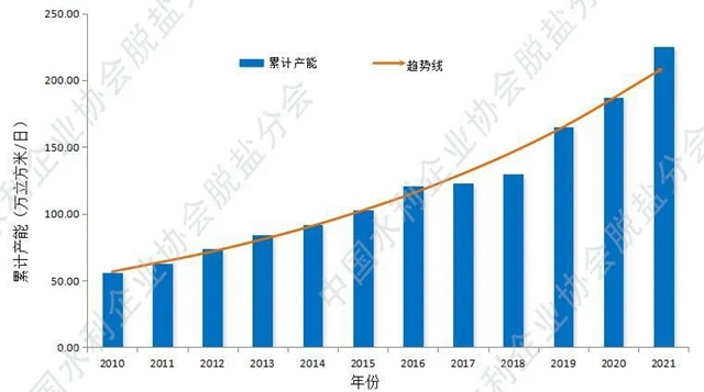 2010-2021年 國內已建成海水淡化項目累計產能