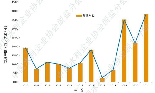 2010-2021年 國內已建成海水淡化項目年度產能