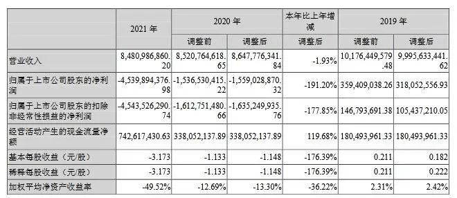同日啟迪環(huán)境披露2021年年度報(bào)告,報(bào)告期內(nèi),公司實(shí)現(xiàn)營業(yè)收入84.81億元,同比下降1.93%,歸屬于上市公司股東凈虧損45.4億元,歸屬于上市公司股東的扣除非經(jīng)常性損益凈虧損45.44億元,基本每股收益-3.173元。