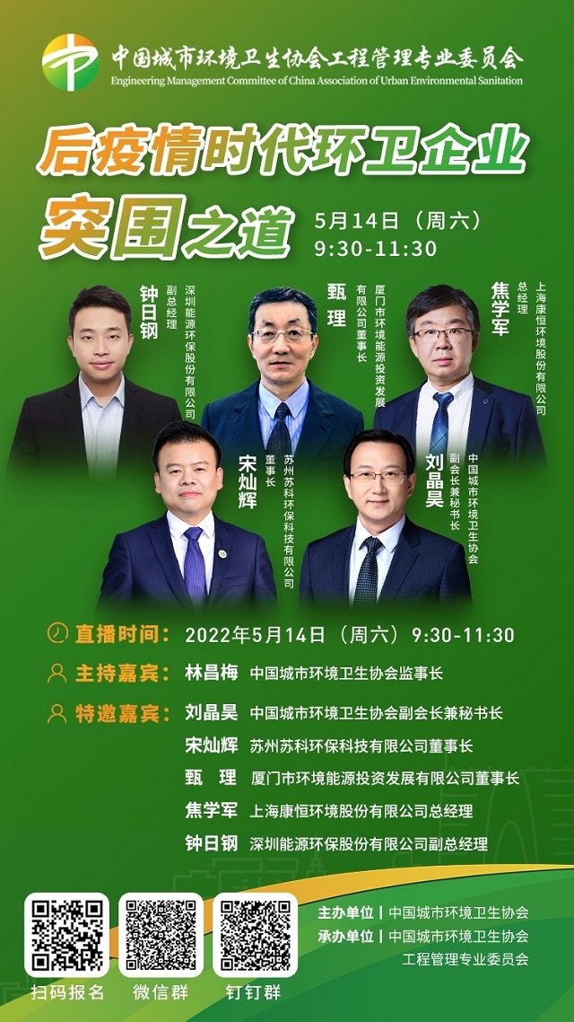 2022年5月14日(周六)上午9:30至11:30,由中國(guó)城市環(huán)境衛(wèi)生協(xié)會(huì)主辦、中國(guó)城市環(huán)境衛(wèi)生協(xié)會(huì)工程管理專業(yè)委員會(huì)承辦的線上主題沙龍【后疫情時(shí)代環(huán)衛(wèi)企業(yè)突圍之道】將正式登陸環(huán)保在線,深切當(dāng)下環(huán)衛(wèi)行業(yè)的困境與難點(diǎn),從優(yōu)秀案例出發(fā)為您一一解答。