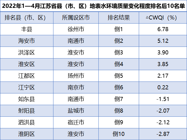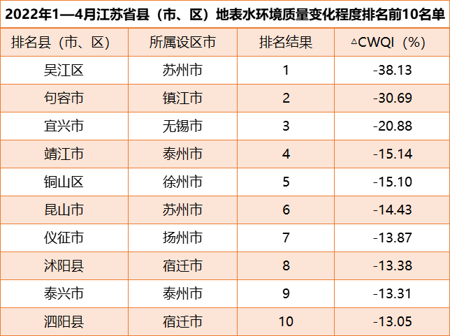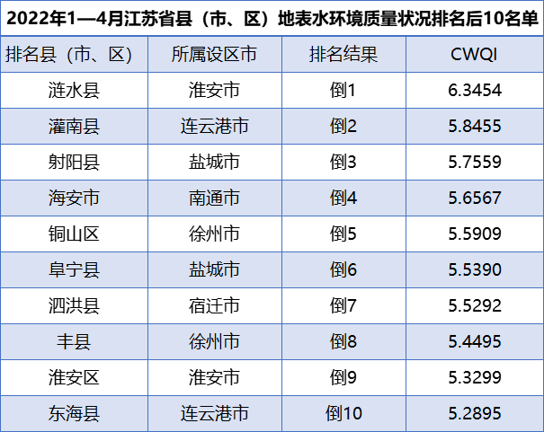 原標(biāo)題:2022年1—4月江蘇省縣(市、區(qū))地表水環(huán)境質(zhì)量排名