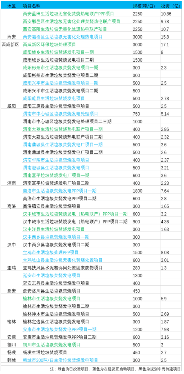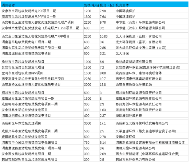 另外網(wǎng)上可查的已經(jīng)開始招標(biāo)以及建設(shè)過程中的項目有14個,總投資金額73.9億元,日處理規(guī)模超過1.3萬多噸。其中西安灞橋區(qū)生活垃圾無害化處理熱電項目規(guī)劃日處理3000噸,與西咸新區(qū)項目并列為陜西最大規(guī)模的生活垃圾焚燒項目,其中一期750噸去年底已經(jīng)點火試運(yùn)行。真正投運(yùn)后,即使不包含西咸新區(qū),西安市的日垃圾焚燒規(guī)模也將超過一萬噸。另外商洛市生活垃圾焚燒發(fā)電PPP項目、寶雞市生活垃圾處理PPP項目、延安市生活垃圾焚燒發(fā)電項目規(guī)劃日處理規(guī)模均超過千噸。如下圖﹕