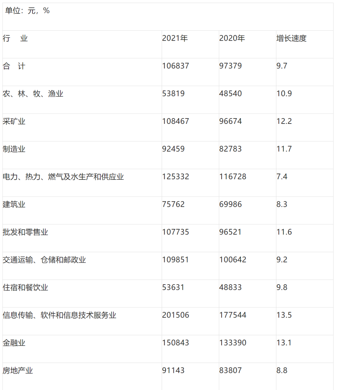行 業(yè) | 2021年 | 2020年 | 增長(zhǎng)速度 |
