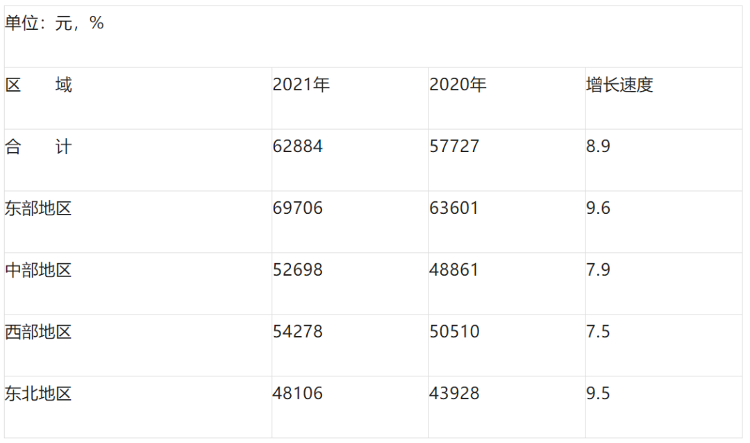 分區(qū)域看,東部地區(qū)年平均工資和增速均最高,年平均工資為124019元,同比增長(zhǎng)10.4%,增速比2020年提高了2.4個(gè)百分點(diǎn);中部地區(qū)年平均工資為85533元,同比增長(zhǎng)9.4%,增速比2020年提高了3.0個(gè)百分點(diǎn);西部地區(qū)年平均工資為94964元,同比增長(zhǎng)7.9%,增速比2020年提高了0.5個(gè)百分點(diǎn);東北地區(qū)年平均工資為83575元,同比增長(zhǎng)7.7%,增速比2020年下降了0.5個(gè)百分點(diǎn)。最高和最低地區(qū)的平均工資之比為1.48,比上年擴(kuò)大0.03。