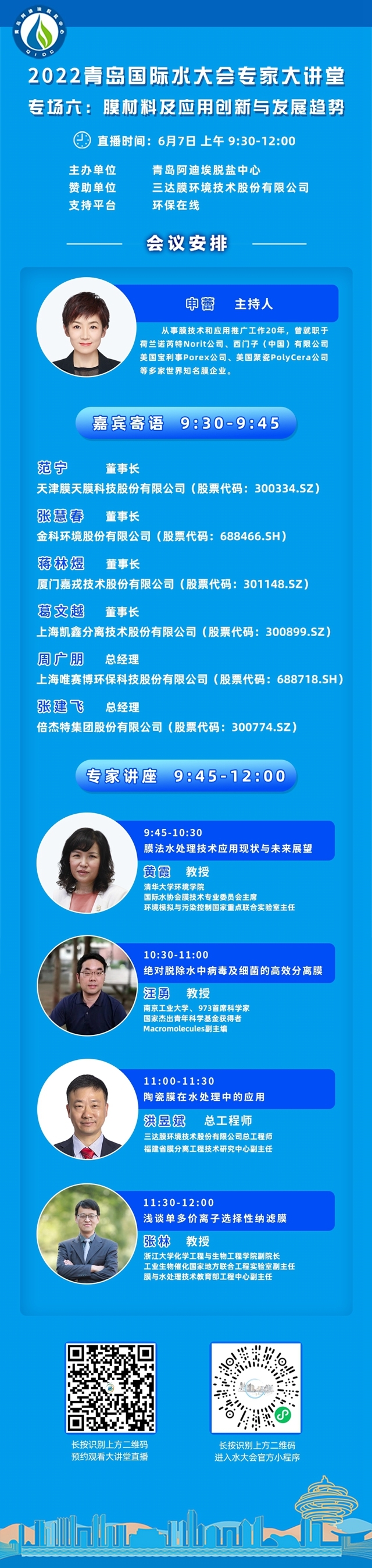2022青島國際水大會專家大講堂又要來啦~與專家共同探討過海水淡化、水資源化、水生態(tài)修復等多個主題,6月7日,讓我們再進入專場六:膜材料及應用創(chuàng)新與發(fā)展趨勢論壇!