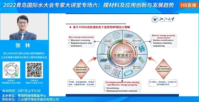 目前,無(wú)論是從鹵水提鋰、工業(yè)廢水分鹽資源化處理,還是從濃海水利用、飲用水鈣鎂選擇性去除等各方面來(lái)看,單/多價(jià)離子鹽分離需求的上漲都是可見(jiàn)的。“納濾是最具潛力的單多價(jià)陽(yáng)離子分離技術(shù)之一”,張林副院長(zhǎng)對(duì)基于不同分離機(jī)理的離子選擇性NF膜設(shè)計(jì)路徑進(jìn)行了分析,還介紹了新型膜材料。