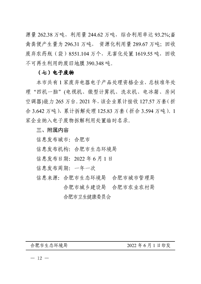 根據(jù)《大中城市固體廢物污染環(huán)境防治信息發(fā)布導(dǎo)則》(原國家環(huán)境保護(hù)總局公告2006年第33號(hào))要求,日前,合肥市生態(tài)環(huán)境局向社會(huì)公開發(fā)布2021年合肥市固體廢物污染環(huán)境防治信息公告,提高公眾對(duì)固體廢物污染環(huán)境防治工作的認(rèn)識(shí),擴(kuò)大公眾參與固體廢物環(huán)境管理的途徑。