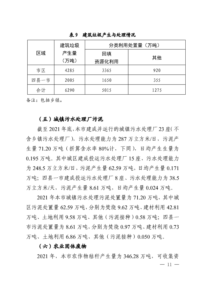 做好生活垃圾處理。2021年,全市城鄉(xiāng)生活垃圾產(chǎn)生量為305.4萬噸,其中餐廚垃圾12.1萬噸。全市共建成居民區(qū)垃圾分類定時(shí)定點(diǎn)集中投放點(diǎn)4311座,共有垃圾焚燒處理廠6座,總處理能力為346.75萬噸/年,餐廚垃圾資源利用處理設(shè)施3座。全部垃圾填埋場(chǎng)已于2021年4月全部封場(chǎng),實(shí)現(xiàn)原生垃圾零填埋,無害化處理率達(dá)到100%。