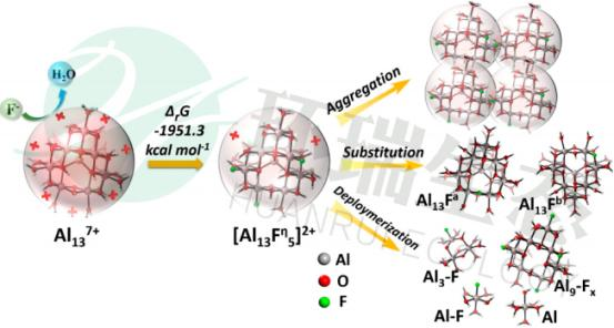 其中“氟凈”系列除氟劑,除氟功能單元含量比市面同類型產(chǎn)品高出20-50%,且主要為經(jīng)特殊設(shè)計的Al13結(jié)構(gòu)。其主要微觀機(jī)理如下所示,Al13結(jié)構(gòu)使得大量的氟離子能夠與OH-實(shí)現(xiàn)交換,去除同樣量的氟化物,用量更少。
