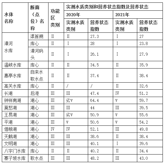 2021年16個(gè)湖庫(kù)監(jiān)測(cè)斷面中,Ⅰ~Ⅲ類水質(zhì)斷面12個(gè),占75%;Ⅳ類水質(zhì)斷面1個(gè),占6.25%;Ⅴ類水質(zhì)斷面3個(gè),占18.75%。具體水質(zhì)類別見表6。
