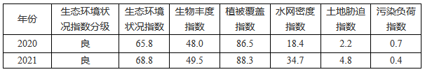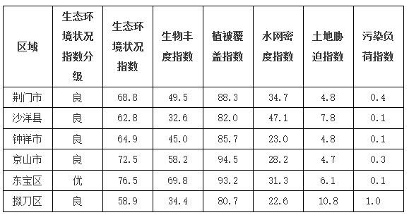 2021年度荊門市全市區(qū)域內(nèi)的生態(tài)環(huán)境狀況指數(shù)見表11。