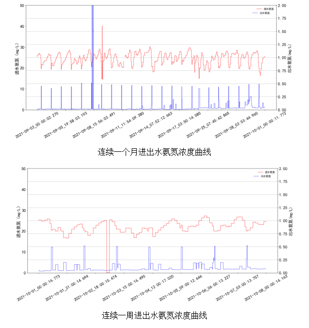 使用精確曝氣系統(tǒng)后,COD、氨氮、總氮等主要出水水質(zhì)指標(biāo)控制達(dá)標(biāo),進出水COD、氨氮濃度曲線如下。由圖中數(shù)據(jù)可看出,AVS精確曝氣系統(tǒng)的運行,對于維持出水水質(zhì)的穩(wěn)定有很大的幫助。