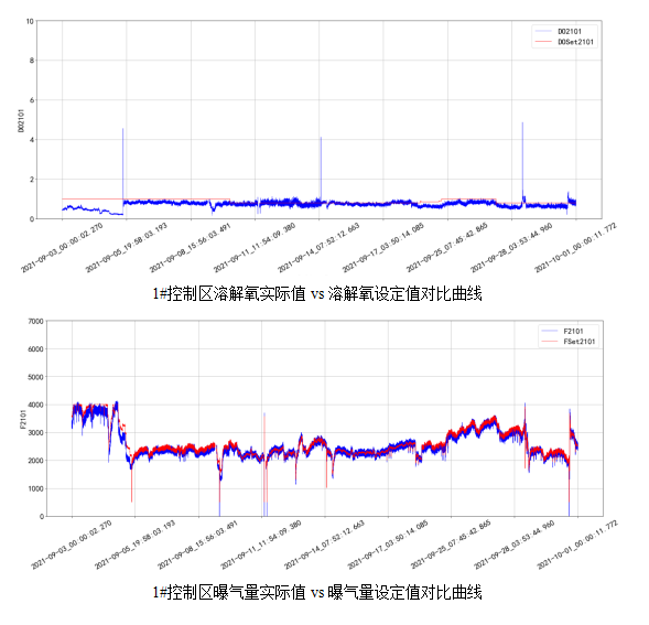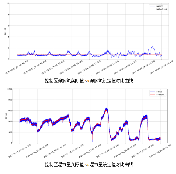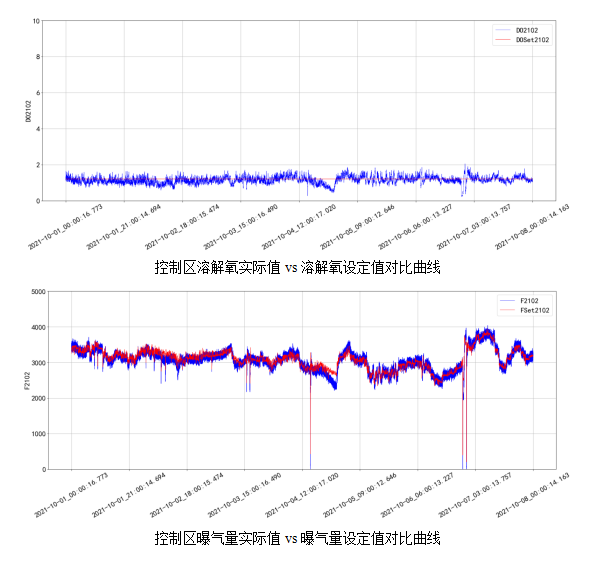 下圖為使用精確曝氣系統(tǒng)后連續(xù)一個月和連續(xù)一周的各溶解氧控制區(qū)溶解氧濃度與氣體流量控制曲線,通過溶解氧控制效果圖可看出,受控溶解氧能夠在設(shè)定目標(biāo)值一定范圍內(nèi)波動,且設(shè)定值與實際值吻合度較好,反映不同溶解氧控制區(qū)的溶解氧濃度滿足控制要求。