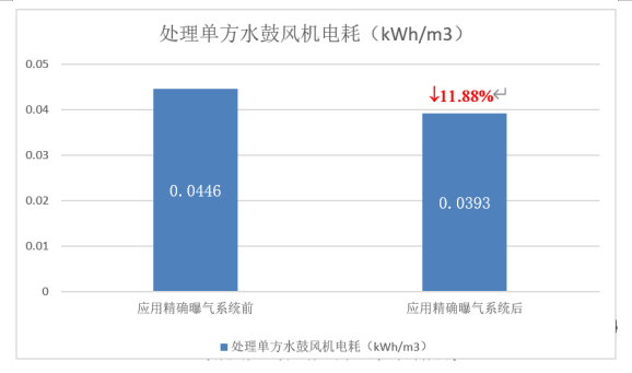 從上表可看出,使用精確曝氣系統(tǒng)前處理單方水鼓風(fēng)機電耗為0.0446 kWh/m³,使用精確曝氣系統(tǒng)后處理單方水鼓風(fēng)機電耗為0.0393 kWh/m³,實現(xiàn)了11.88%的鼓風(fēng)機能耗節(jié)省