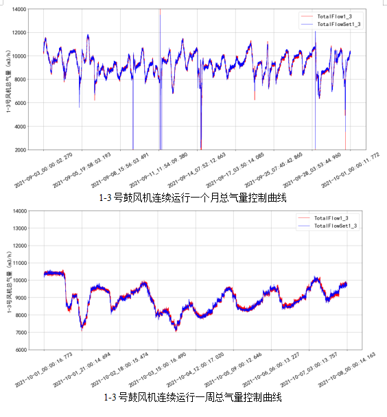 使用精確曝氣系統(tǒng)后連續(xù)一個月和連續(xù)一周的鼓風(fēng)機控制曲線如下,由圖中曲線可看出,AVS精確曝氣系統(tǒng)能夠根據(jù)進水水量和水質(zhì)的變化,自動、實時的計算出生化系統(tǒng)所需曝氣量,并根據(jù)AVS系統(tǒng)計算得出的理論需氣量對鼓風(fēng)機進行實時控制,實現(xiàn)了控制鼓風(fēng)機啟停、運行負(fù)荷的變化,做到了生化系統(tǒng)的“按需供氣”。