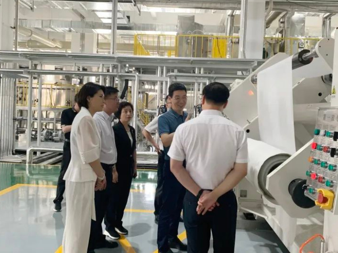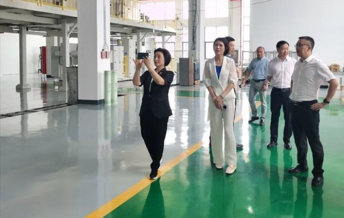 竺主席及徐主任一行實地參觀了浙江易膜新材料科技有限公司廠區(qū)和生產(chǎn)現(xiàn)場,深入了解建設(shè)情況和生產(chǎn)經(jīng)營情況,現(xiàn)場參觀了數(shù)字化制膜線和卷膜線,以及“領(lǐng)雁”重點研發(fā)攻關(guān)項目的海水淡化膜新產(chǎn)線,并對該項目一期工作順利投產(chǎn)給予充分肯定。