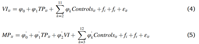 關(guān)鍵解釋變量為T(mén)P,即當(dāng)年ETS是否實(shí)施(T)與企業(yè)是否屬于碳市場(chǎng)試點(diǎn)地區(qū)(P)兩個(gè)虛擬變量的交乘項(xiàng),系數(shù)α1反映政策實(shí)施后,試點(diǎn)地區(qū)與非試點(diǎn)地區(qū)高碳企業(yè)市場(chǎng)支配力變化的差異??刂菩袠I(yè)固定效應(yīng)與時(shí)間固定效應(yīng)。