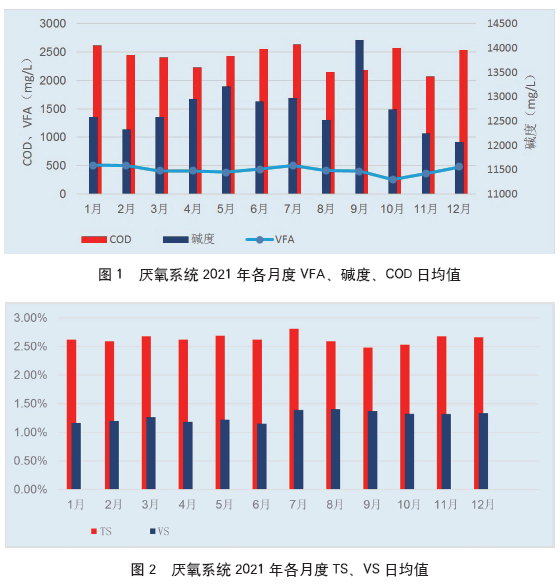廣州福山生物質(zhì)綜合處理廠厭氧系統(tǒng)2021年運行狀況見圖1、圖2。