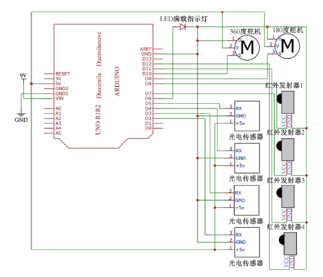 下位機硬件電路設(shè)計如圖4所示,Arduino 工作電壓一般為3~5 V,符合Led指示燈和4個紅外發(fā)射器的電壓要求,故可直接將該5個器件連接在引腳與CND之間,實現(xiàn)開關(guān)控制。LED正極連接Arduino 6號引腳,紅外發(fā)射器1、2、3、4的正極分別連接Arduino的 11、12、8、7號引腳。同理,2個舵機通過Arduino的+5V和 GND形成回路進行供電。2個舵機均通過PWM信號控制,對應(yīng)Arduino 10號引腳和9號引腳,通過不同的占空比轉(zhuǎn)動對應(yīng)的角度,實現(xiàn)了云臺及翻斗的精準(zhǔn)控制。4個光電傳感器供電原理同上,RX引腳分別連接Arduino 的5、4、3、2引腳,同時將Arduino 上的這4個引腳定義為輸入模式,實時檢測垃圾桶的裝載狀態(tài)。