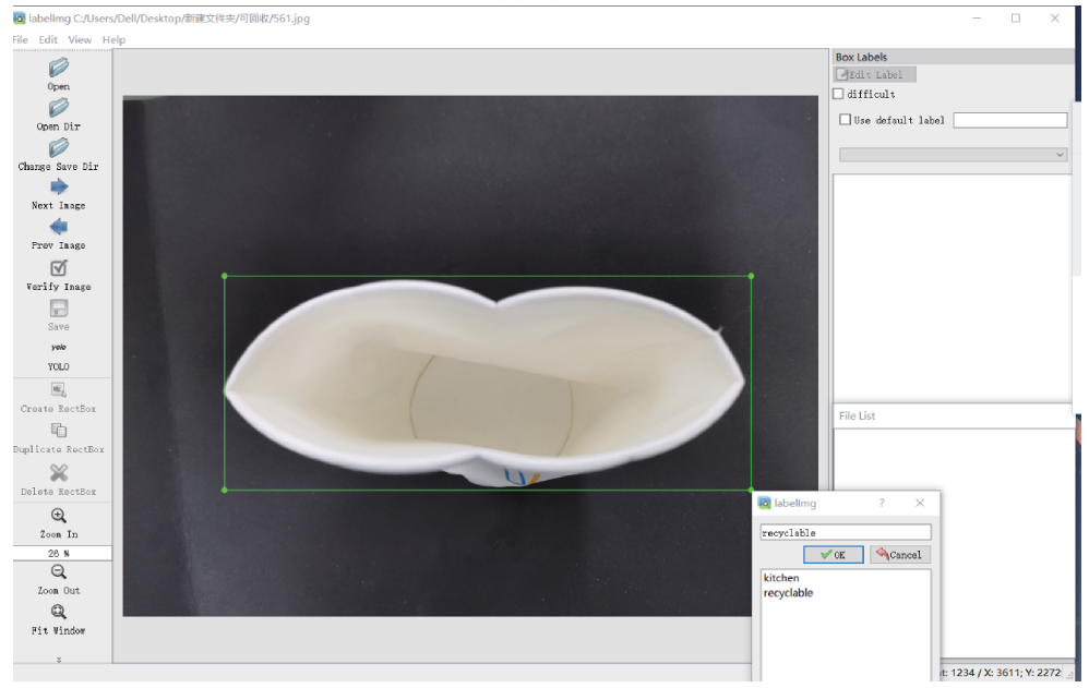 本設(shè)計以常見垃圾為例,尤其針對非住宅區(qū)的公共場所(如地鐵站﹑火車站、學(xué)校等場所)所產(chǎn)生的垃圾為例進行算法研究,收集的常見垃圾數(shù)據(jù),包括食品包裝紙、礦泉水瓶、飲料瓶、易拉罐、塑料盒、電池、水果皮核、干果殼等。每一小類采集了約100張數(shù)據(jù),包括不同拍攝角度,不同腐壞程度等,共采集了4000張數(shù)據(jù),其中 3500張用于訓(xùn)練,500張用于測試。再將每小類劃分到廚余垃圾、可回收垃圾、有害垃圾以及其他垃圾中。部分不同垃圾的真實訓(xùn)練數(shù)據(jù)集如圖6所示。標(biāo)注工具采用LabelImg 軟件進行標(biāo)注,標(biāo)注過程如圖7所示。