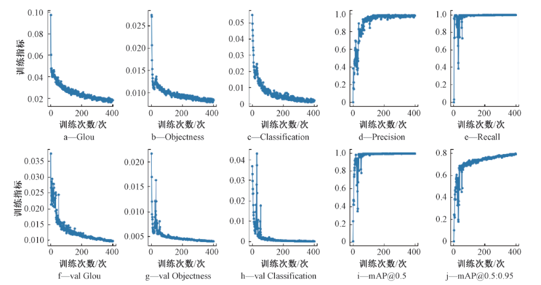 圖9反映了隨著次數(shù)增加,訓(xùn)練指標(biāo)的變化趨勢。總訓(xùn)練次數(shù)為400輪。其中, GIoU為訓(xùn)練數(shù)據(jù)集模型的損失函數(shù);Objectness為目標(biāo)的損失函數(shù)均值,值越小目標(biāo)檢測越準(zhǔn)確;Classification為分類的損失函數(shù)均值,值越小目標(biāo)檢測越準(zhǔn)確;Precision表示精度;Recall表示召回率。從圖9可以看出:隨著訓(xùn)練次數(shù)的增加,精度和召回率在不斷升高,最終穩(wěn)定在接近100%的數(shù)值附近; f~h前面加了val,表示為驗證數(shù)據(jù)集的結(jié)果;mAP表示mean AveragePrecision , 即平均精度, mAP@ 0.5參數(shù)為損失函數(shù)設(shè)為0.5時,每一類圖片的AP值的平均; mAP@ 0.5 :0.95表示損失函數(shù)在步長為0.5、范圍在0.5~0.95閾值下的平均mAP。從圖9中可以看出,當(dāng)訓(xùn)練達到80輪左右時, mAP@ 0.5上升到了1.0 , mAP@ 0.5∶0.95上升到了0.7左右,并且隨著訓(xùn)練輪數(shù)的增加不斷提高,最終達到0.8左右,訓(xùn)練精度較高。
