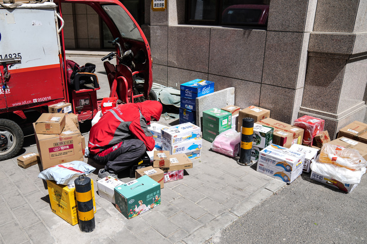 2022年4月26日,在北京市一小區(qū)門口,快遞員在整理貨品準備投遞。新華社記者 彭子洋攝