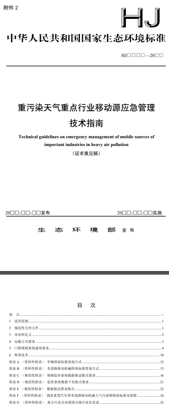 《重污染天氣重點行業(yè)移動源應(yīng)急管理技術(shù)指南(征求意見稿)》規(guī)定了重污染天氣重點行業(yè)移動源運輸方式、門禁視頻系統(tǒng)建設(shè)、核查技術(shù)及數(shù)據(jù)報送要求,由由生態(tài)環(huán)境部大氣環(huán)境司、法規(guī)與標準司組織制訂。