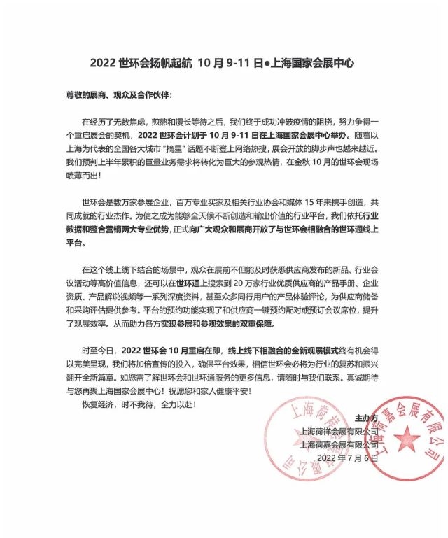 時至今日,2022世環(huán)會10月重啟在即,線上線下相融合的全新觀展模式終有機會得以呈現(xiàn),我們將加倍宣傳的投入,確保平臺效果,相信世環(huán)會必將為行業(yè)的復蘇和振興翻開全新篇章。如您需了解世環(huán)會和世環(huán)通服務的更多信息,請隨時與我們聯(lián)系。真誠期待與您再聚上海國家會展中心!祝愿您和家人健康平安!
