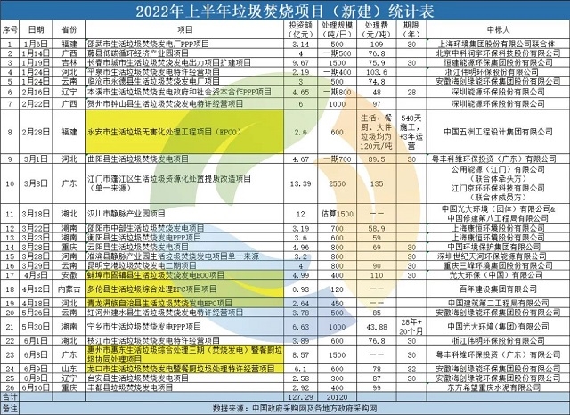▼2022年上半年垃圾焚燒項(xiàng)目(新建)統(tǒng)計(jì)表(注:標(biāo)黃為焚燒+協(xié)同處置項(xiàng)目,共計(jì)6個(gè))