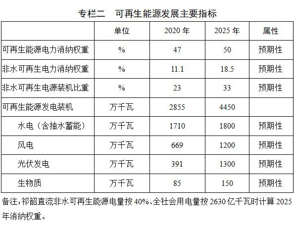 對標(biāo)國家總體目標(biāo),結(jié)合我省實(shí)際,在“十四五”期間努力實(shí)現(xiàn)可再生能源“綠色貢獻(xiàn)更大、利用領(lǐng)域更廣、使用成本更低、產(chǎn)業(yè)結(jié)構(gòu)更優(yōu)”的發(fā)展目標(biāo)。到2025年,可再生能源發(fā)電裝機(jī)規(guī)模達(dá)到約4450萬千瓦,其中水電1800萬千瓦,非水可再生能源2650萬千瓦,全省可再生能源電力消納責(zé)任權(quán)重穩(wěn)定在50%左右,非水可再生能源電力消納責(zé)任權(quán)重達(dá)到18.5%左右,非化石能源消費(fèi)占一次能源消費(fèi)總量的22%以上。