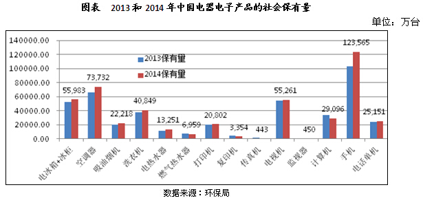廢棄電器電子產(chǎn)品理論報廢量的測算為行業(yè)管理提供重要的依據(jù)。根據(jù)國家統(tǒng)計年鑒電器電子產(chǎn)品居民百戶擁有量與居民戶數(shù)測算的居民保有量見下圖。除固定電話和黑白電視機(jī)之外,其他產(chǎn)品均逐年增長,其中移動電話的增長速度最高。中投顧問發(fā)布的《2017-2021年中國電子廢棄物處理行業(yè)深度調(diào)研及投資前景預(yù)測報告》指出,2013和2014年中國電器電子產(chǎn)品的社會保有量持續(xù)上升,社會保有量是根據(jù)電器電子產(chǎn)品銷量與對于該年報廢系數(shù)乘積的方法進(jìn)行的測算。