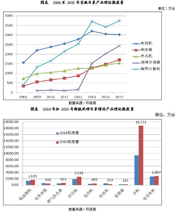 2015年首批目錄產(chǎn)品的理論報廢量增幅放緩,同比增加9.32%。在政策激勵下,從2013年開始,電冰箱、洗衣機(jī)、房間空調(diào)器和微型計算機(jī)的理論報廢量逐年上漲,但電視機(jī)的理論報廢量小幅下降。2015年,新增目錄產(chǎn)品中手機(jī)的理論報廢量同比增加約50%。