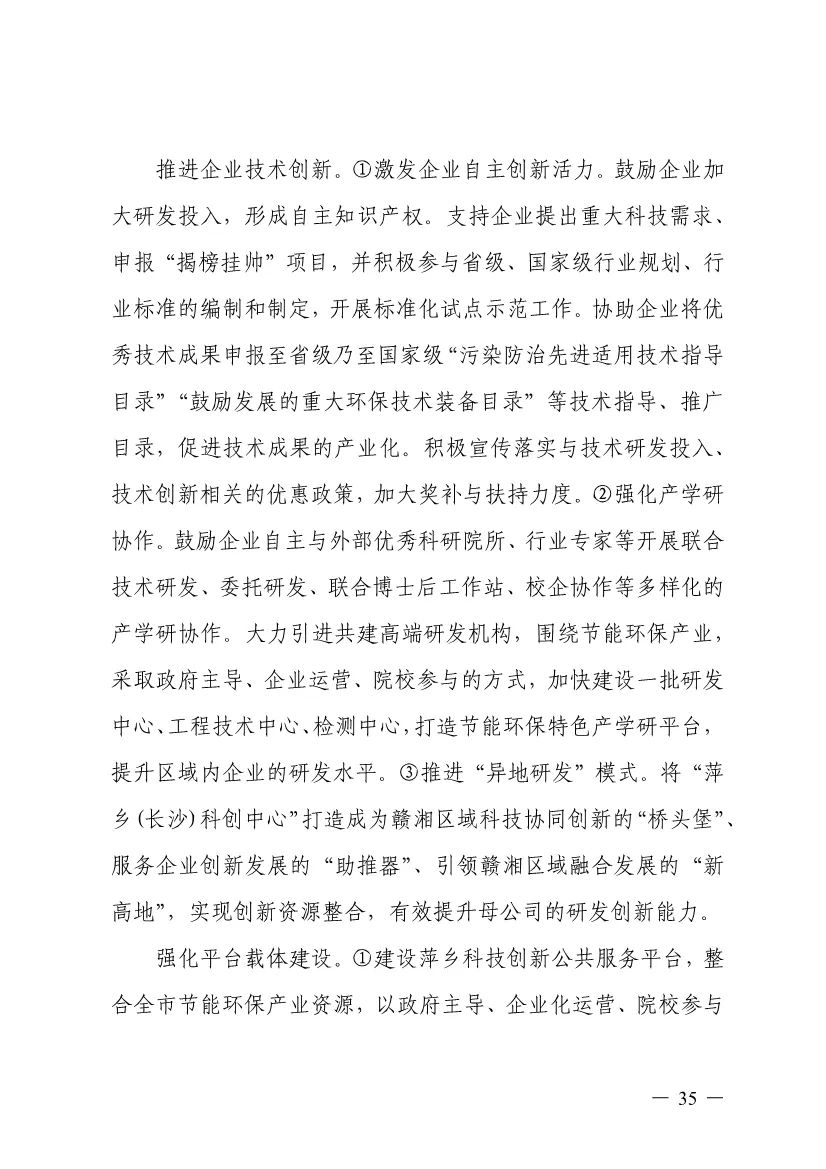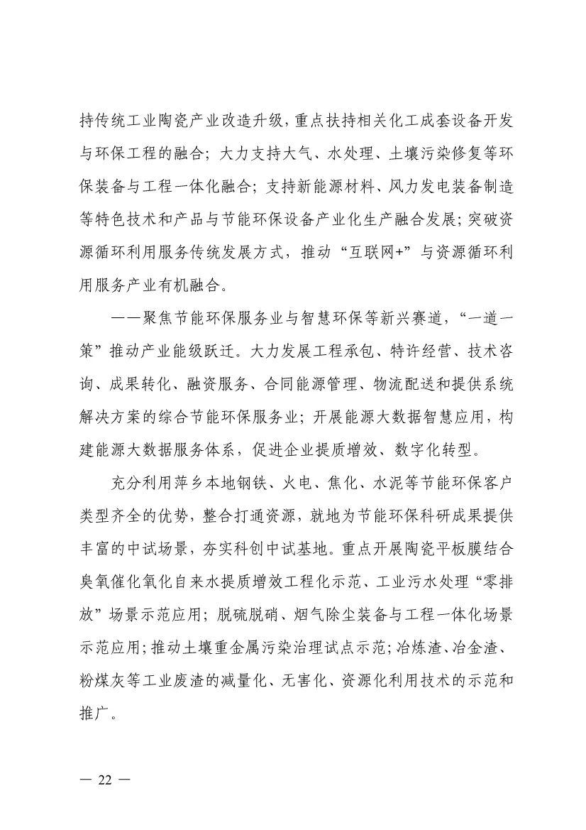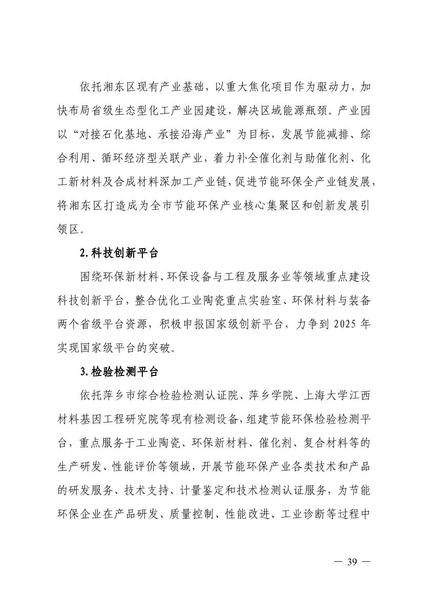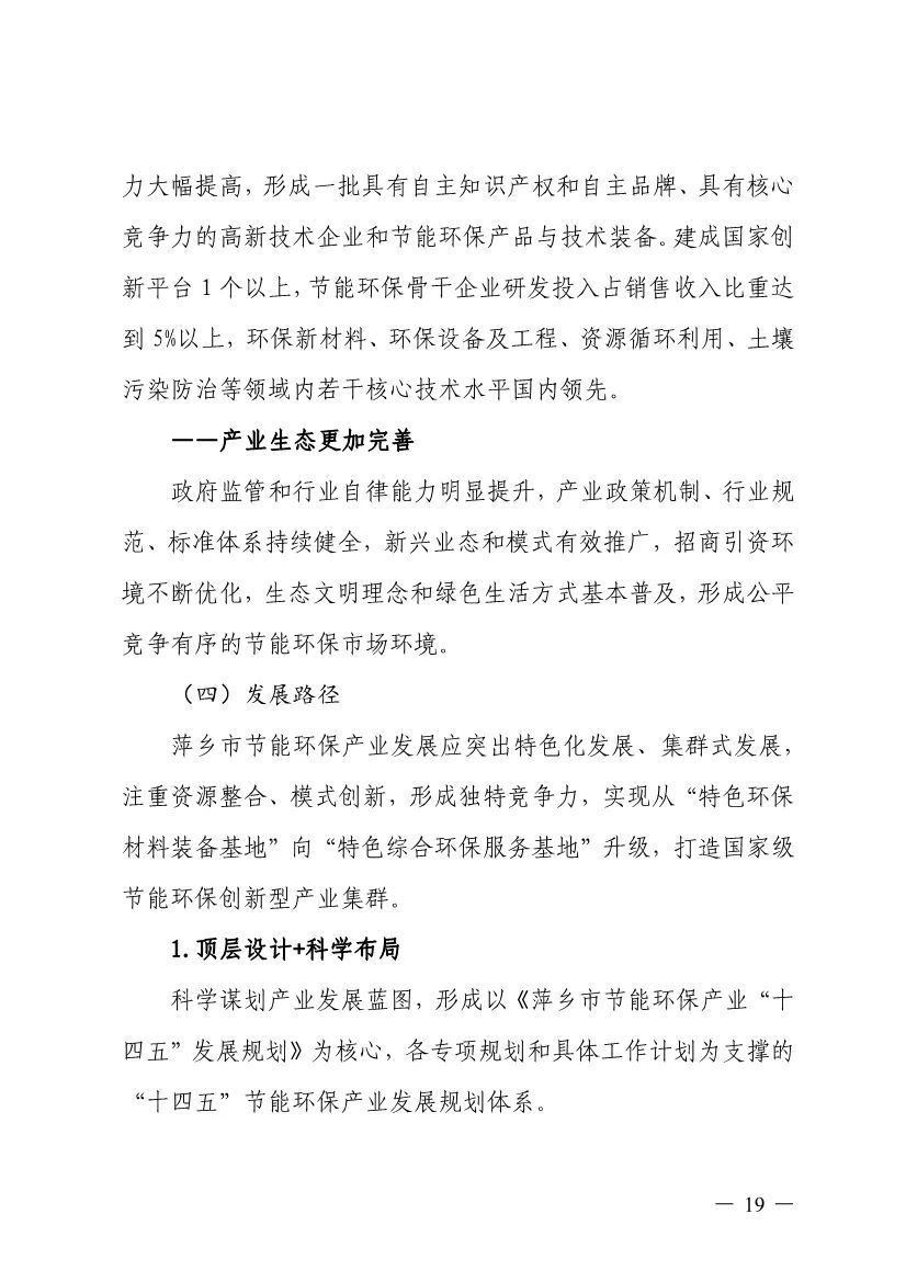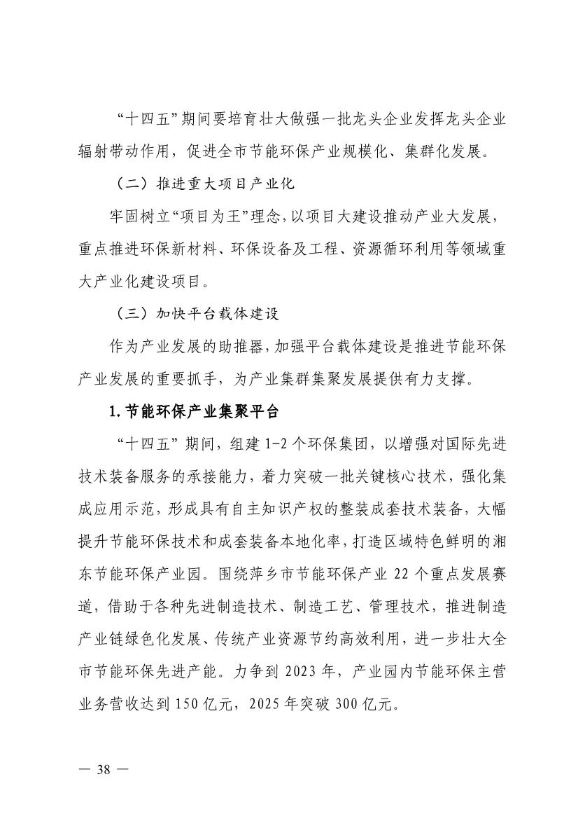 “十四五”期間,組建1-2個環(huán)保集團,以增強對國際先進技術裝備服務的承接能力,著力突破一批關鍵核心技術,強化集成應用示范,形成具有自主知識產權的整裝成套技術裝備,大幅提升節(jié)能環(huán)保技術和成套裝備本地化率,打造區(qū)域特色鮮明的湘東節(jié)能環(huán)保產業(yè)園。