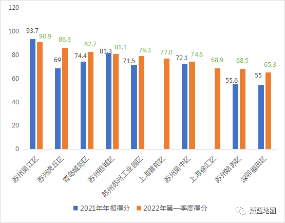 得分前十的城市主城區(qū)中,蘇州參評(píng)的六個(gè)城區(qū)依舊盡數(shù)在榜,位次略有變化,吳江區(qū)以90.9分保持第一,虎丘區(qū)、姑蘇區(qū)得分有明顯增長。上海普陀區(qū)、徐匯區(qū)取代南京玄武區(qū)和深圳羅湖區(qū)進(jìn)入前十,位居第六和第八。