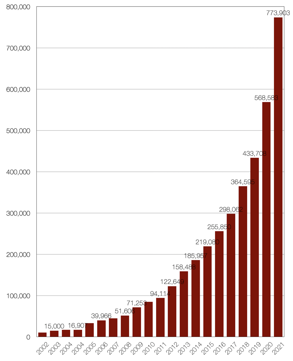 圖3.我國生活垃圾焚燒處理能力的增長情況(2002-2021)