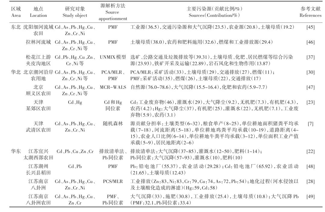 華東地區(qū)的土壤重金屬源解析工作研究程度比較高,收集到的相關(guān)文獻(xiàn)有40篇,區(qū)域主要集中在浙江、江蘇和山東,涉及6071個(gè)表層土壤樣品,所采用的定性源解析方法主要為PCA、相關(guān)分析、CA、空間分析等,定量源解析方法有PMF、同位素比值法及混合方法等(表3)。該地區(qū)土壤中的主要污染元素仍為Cd,其次為Cu、Hg等。山東壽光地區(qū)的大棚土中,Cd、Cu、Zn、Hg受控于施用肥料和農(nóng)藥等農(nóng)業(yè)活動(dòng),As、Pb、Cr、Ni則主要來(lái)源于土壤母質(zhì),后三者還有工業(yè)活動(dòng)的貢獻(xiàn)。而南京地區(qū)農(nóng)田土壤中的Cd則主要來(lái)源于土壤母質(zhì)和肥料等農(nóng)業(yè)投入品這兩者的貢獻(xiàn);Cu和Zn的來(lái)源一致,以農(nóng)業(yè)投入品(如肥料)為主,其次還有大氣沉降(交通、工業(yè)活動(dòng))的貢獻(xiàn);Hg的來(lái)源復(fù)雜,受土壤母質(zhì)、工業(yè)排放(如燃煤)、交通、農(nóng)業(yè)(如高Hg農(nóng)藥)等多因素影響;As則主要受控于土壤母質(zhì)及交通和工業(yè)活動(dòng)引起的大氣沉降;Pb來(lái)源于大氣沉降(交通、工業(yè)活動(dòng))的貢獻(xiàn);Cr和Ni除了受工業(yè)活動(dòng)的影響,部分地區(qū)使用的肥料對(duì)Cr也有貢獻(xiàn)??傮w來(lái)看,工業(yè)活動(dòng)的貢獻(xiàn)在南京地區(qū)相對(duì)較高,與定量解析結(jié)果基本一致(表2)。對(duì)于浙江地區(qū),其土壤中各重金屬元素的污染來(lái)源基本與南京地區(qū)一致,但Cd和Cu以及Pb和As還分別增加了工業(yè)(如鉛電池廠、電子廢料等)以及農(nóng)業(yè)活動(dòng)(如肥料施用)的貢獻(xiàn)。總體來(lái)看,土壤母質(zhì),人為污染源中大氣沉降(工業(yè)和交通)、農(nóng)業(yè)活動(dòng)以及工業(yè)活動(dòng)是南京和浙江地區(qū)農(nóng)田土壤中Cd、As、Pb、Hg、Cu、Zn的主要污染來(lái)源,與安徽、上海、福建地區(qū)的污染源類型基本一致。對(duì)于華東地區(qū)非農(nóng)業(yè)土地利用類型的土壤來(lái)說,尤其是工業(yè)區(qū)附近,除部分元素(如 As、Cu、Cr、Ni)主要受控于土壤母質(zhì)外,主要是工業(yè)活動(dòng)造成了土壤中其他重金屬元素的累積。