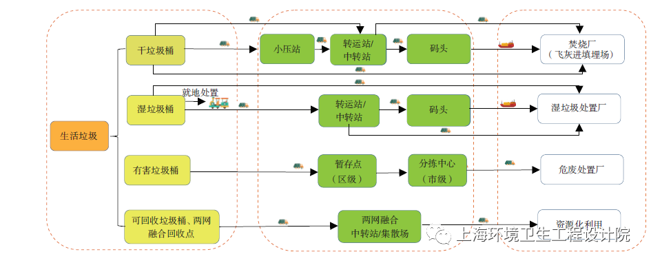 《條例》實(shí)施后,垃圾分類(lèi)收集運(yùn)輸、分類(lèi)處理體系能否適應(yīng)前端分類(lèi)垃圾理化特性變化是目前環(huán)境衛(wèi)生工程領(lǐng)域的一大科學(xué)問(wèn)題。目前,干垃圾通過(guò)直運(yùn)或經(jīng)中轉(zhuǎn)站及碼頭壓縮轉(zhuǎn)運(yùn)至焚燒廠;濕垃圾采用就地就近處理,或直運(yùn)或經(jīng)中轉(zhuǎn)站運(yùn)輸至濕垃圾處理廠集中處理。分類(lèi)垃圾理化特性變化對(duì)生活垃圾收運(yùn)、處置均產(chǎn)生一定影響。