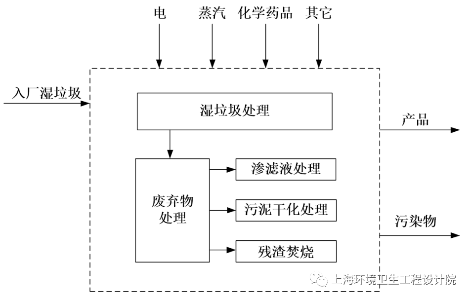 本文的研究邊界如圖2所示。針對(duì)濕垃圾處理整體工藝,本研究暫不關(guān)注中間具體工藝環(huán)節(jié)(破碎/制漿等),以整廠范圍為邊界,以入廠物質(zhì)為輸入,出廠物質(zhì)為輸出。出廠物質(zhì)以直接排放到大氣、水體(包括納管)的物質(zhì)(SOx、COD等)為準(zhǔn)。當(dāng)出廠物質(zhì)為雜物時(shí),需匹配殘?jiān)贌に?當(dāng)出廠物質(zhì)為滲瀝液時(shí),需匹配滲瀝液處理工藝;當(dāng)出廠物質(zhì)為污泥時(shí),需匹配污泥干化焚燒工藝。