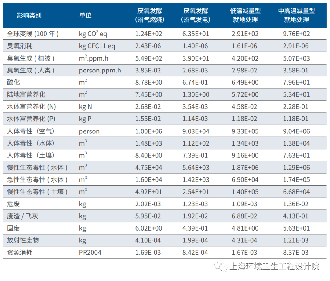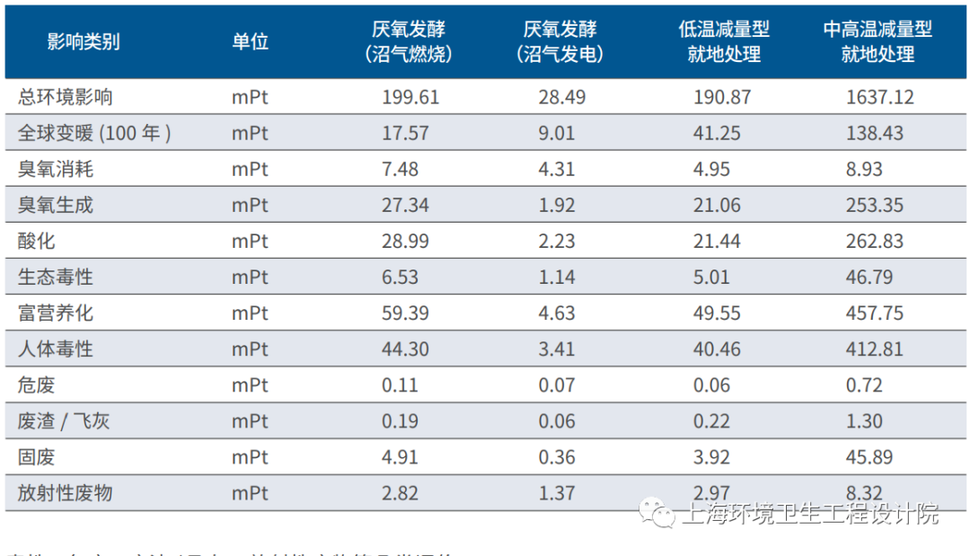 本文對(duì)厭氧發(fā)酵(沼氣燃燒)、厭氧發(fā)酵(沼氣發(fā)電)、低溫減量型就地處理、中高溫減量型就地處理四種典型工藝進(jìn)行了生命周期環(huán)境影響對(duì)比研究。通過(guò)數(shù)據(jù)收集、清單分析和結(jié)果評(píng)價(jià),得出以下結(jié)論: