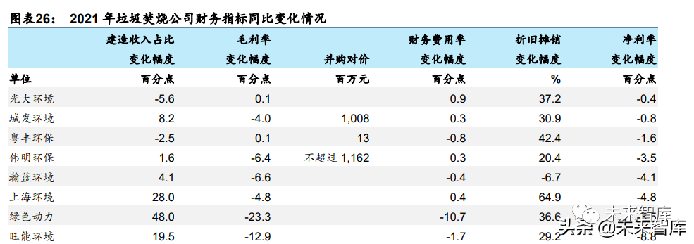 財(cái)務(wù)費(fèi)用和折舊攤銷(xiāo)影響下,產(chǎn)能增長(zhǎng)有望穩(wěn)定盈利水平。2021 年偉明環(huán)保和城發(fā)環(huán)境均 實(shí)施了較大規(guī)模的并購(gòu),并購(gòu)交易對(duì)價(jià)分別為不超過(guò) 11.62/10.08 億元,其財(cái)務(wù)費(fèi)用率同比 均有小幅提升,我們認(rèn)為,并購(gòu)在短期會(huì)帶來(lái)財(cái)務(wù)費(fèi)用增長(zhǎng),但投運(yùn)產(chǎn)能的不斷增加將提 供穩(wěn)健現(xiàn)金流,改善公司財(cái)務(wù)結(jié)構(gòu),有望消除財(cái)務(wù)費(fèi)用增加的短期影響。綠色動(dòng)力由于首 次確認(rèn)建造收入和固廢業(yè)務(wù)增長(zhǎng),2021 年?duì)I業(yè)收入同比+122%,因此財(cái)務(wù)費(fèi)用率下降 10.7pp。新增投運(yùn)產(chǎn)能帶來(lái)折舊攤銷(xiāo)上漲,項(xiàng)目投運(yùn)初期產(chǎn)能利用率較低,盈利能力相對(duì) 較低,我們認(rèn)為,投運(yùn)項(xiàng)目產(chǎn)能度過(guò)爬坡期之后,盈利能力可達(dá)到穩(wěn)定狀態(tài)。