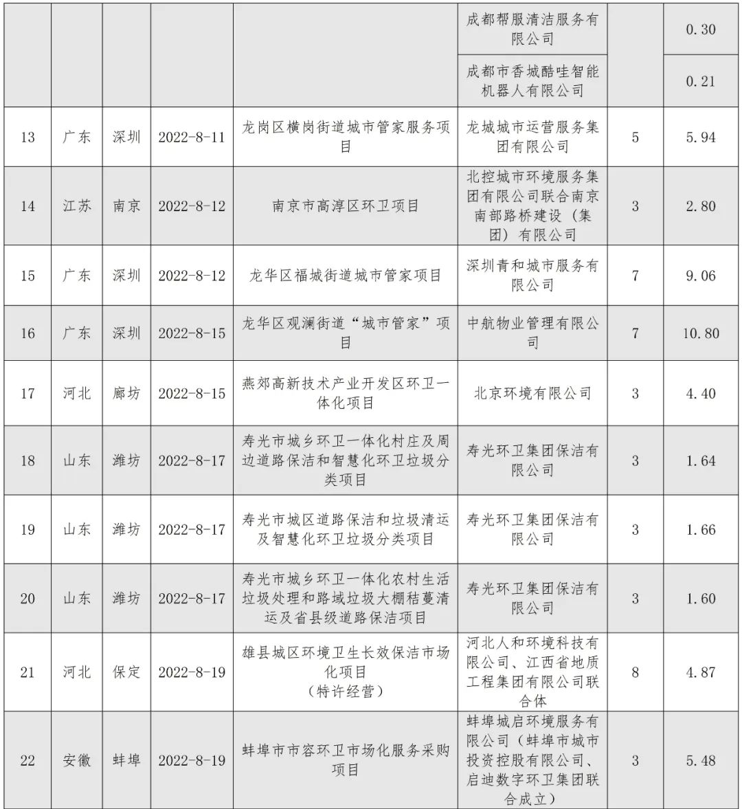 8月,河北昌潤(rùn)達(dá)環(huán)境工程有限公司憑借19.36億元的定州市城區(qū)環(huán)境衛(wèi)生市場(chǎng)化服務(wù)項(xiàng)目登頂企業(yè)月度排行榜榜首。定州市城區(qū)環(huán)境衛(wèi)生市場(chǎng)化服務(wù)項(xiàng)目特許經(jīng)營(yíng)期12年。服務(wù)范圍為河北省定州市市區(qū)西城、北城、南城、長(zhǎng)安辦、經(jīng)濟(jì)開發(fā)區(qū)及高速高鐵站主次干道、小街巷、商業(yè)街區(qū)、便民市場(chǎng)和市區(qū)水域,清掃保潔總面積9617672.66平方米,項(xiàng)目負(fù)責(zé)公共區(qū)域生活垃圾(不含物業(yè)小區(qū)其他垃圾)產(chǎn)生量每天200~260噸。昌潤(rùn)達(dá)以1.61億元/年的投標(biāo)報(bào)價(jià)位中標(biāo)該項(xiàng)目。昌潤(rùn)達(dá)成立于2014年8月,位于保定市國家大學(xué)科技園8號(hào)樓,是河北省首批成立的一家集垃圾分類、城鄉(xiāng)環(huán)衛(wèi)一體化、公用設(shè)施管理維護(hù)、農(nóng)村廁改與吸污處理、智慧環(huán)衛(wèi)等多位一體的科技型環(huán)衛(wèi)一體化大型集團(tuán),系中國清潔服務(wù)行業(yè)百強(qiáng)企業(yè)。昌潤(rùn)達(dá)是一家典型的立足本土的環(huán)衛(wèi)企業(yè),其服務(wù)區(qū)域主要集中在保定市及周邊縣、區(qū)和邯鄲市部分縣鄉(xiāng)村。2021年8月,知名物企佳兆業(yè)美好曾宣布擬以3.67億元的價(jià)格收購昌潤(rùn)達(dá)70%的股權(quán),但最終因“公司經(jīng)營(yíng)策略調(diào)整”,交易在年底告吹。從今年中標(biāo)的項(xiàng)目來看,昌潤(rùn)達(dá)似乎還沒有準(zhǔn)備走出河北,依舊在深耕自己的“一畝三分地”。● 北控城市環(huán)境連下五城,全年項(xiàng)目金額超48億元8月,北控城市環(huán)境迎來一波拿標(biāo)高潮,連續(xù)中標(biāo)5個(gè)環(huán)衛(wèi)項(xiàng)目,合計(jì)中標(biāo)金額達(dá)17.57億元,一舉拿下榜眼位置。表2 北控城市環(huán)境8月中標(biāo)項(xiàng)目匯總
