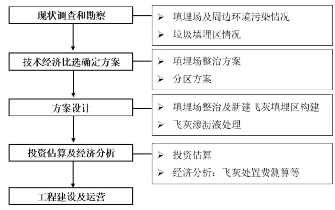根據(jù)住房城鄉(xiāng)建設(shè)部發(fā)布的《2022年中國城市建設(shè)狀況公報》,截至2022年底,全國城市生活垃圾焚燒處理能力已達 80.46萬噸/日,占比為72.53%。我國生活垃圾焚燒爐型主要為機械爐排爐和循環(huán)流化床,其中機械爐排爐飛灰產(chǎn)率一般為2%~5%,循環(huán)流化床飛灰產(chǎn)率一般為8%~15%。飛灰產(chǎn)率按3%~5%計算,則年產(chǎn)飛灰量約為881萬~1468萬噸。由于含有較高浸出濃度的重金屬和高毒性當量的二噁英等有毒有害物質(zhì),生活垃圾焚燒飛灰被列入《國家危險廢物名錄》。根據(jù)《2022年生態(tài)環(huán)境公報》,2022年工業(yè)危險廢物產(chǎn)生量為9514.8萬噸,飛灰占比約為9.2%~15.4%,飛灰產(chǎn)量較大。飛灰的妥善處置關(guān)系到生活垃圾焚燒廠的穩(wěn)定運行,也是生活垃圾焚燒行業(yè)的難題和短板。目前,飛灰處置方式包括進入危險廢物填埋場填埋處置、固化/穩(wěn)定化處理后進入生活垃圾填埋場填埋處置、水洗預(yù)處理后水泥窯協(xié)同處置、高溫熔融/玻璃化、高溫燒結(jié)等,其中,固化/穩(wěn)定化處理后進入生活垃圾填埋場填埋處置由于技術(shù)成熟且成本較低,是當前飛灰處置的主流技術(shù)。對于新建填埋場選址困難或飛灰產(chǎn)量較小的地區(qū),對現(xiàn)有生活垃圾填埋場進行分區(qū)改造以滿足固化/穩(wěn)定化飛灰填埋要求是較為經(jīng)濟可行的方式。隨著生活垃圾焚燒發(fā)電廠的建成,現(xiàn)有生活垃圾填埋場將停止接收生活垃圾,若現(xiàn)有生活垃圾填埋場尚有可利用的剩余庫容,對其進行分區(qū)改造,既可以充分發(fā)揮其稀缺資源作用,又可以解決生活垃圾焚燒廠的飛灰處置和大修期內(nèi)生活垃圾應(yīng)急處置問題,同時還可以完善生活垃圾填埋場的現(xiàn)有設(shè)施并治理現(xiàn)存污染,可謂一舉多得。因此,分區(qū)改造項目的建設(shè)十分必要且具有意義。總的來說,項目的建設(shè)具有較好的經(jīng)濟、環(huán)保和社會效益,具體體現(xiàn)在:經(jīng)濟效益:固化/穩(wěn)定化飛灰填埋收益可部分覆蓋現(xiàn)有生活垃圾填埋場治理投資;環(huán)保效益:現(xiàn)有生活垃圾填埋場污染問題得到改善、飛灰得到妥善處置;社會效益:填埋場原址改造,避免了新選址帶來的占用土地資源、搬遷、新的環(huán)境影響源等問題。如前所述,生活垃圾填埋場分區(qū)改造具有填埋場治理及飛灰入場填埋的雙重屬性,因此,其建設(shè)流程可以參考生活垃圾衛(wèi)生填埋場封場治理、擴建,并結(jié)合項目的實際情況及當?shù)叵嚓P(guān)主管部門的要求進行,從建設(shè)方案角度,推薦建設(shè)流程如下圖所示:
