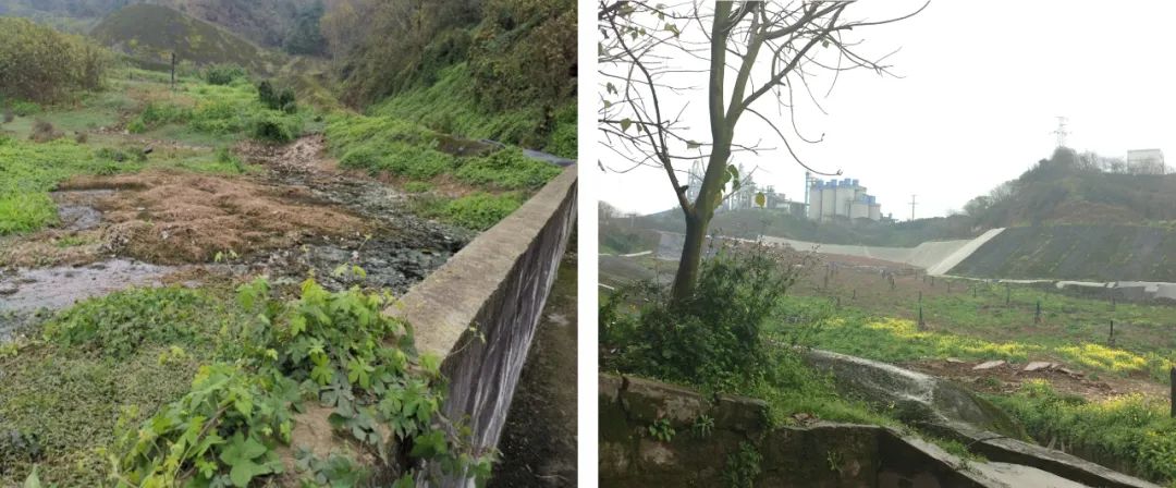 ▲圖1 生活垃圾填埋場分區(qū)改造建設(shè)流程現(xiàn)狀調(diào)查和勘察是首要步驟。現(xiàn)狀調(diào)查和勘察可以厘清填埋場現(xiàn)狀污染和現(xiàn)狀設(shè)施情況,同時為堆體的穩(wěn)定安全性及改造方案提供依據(jù)。根據(jù)現(xiàn)有垃圾填埋情況,填埋場整治方案分為原位治理和異地處置兩種,異地處置一般適用于已填垃圾量較少的情況,對于垃圾填埋量較大的填埋場,通常選用原位治理方案。分區(qū)方案大致可以分為水平分區(qū)和垂直分區(qū)兩種,顧名思義,水平分區(qū)就是固化/穩(wěn)定化飛灰填埋區(qū)和生活垃圾填埋區(qū)為水平方向上的兩個獨立庫區(qū),垂直分區(qū)就是在現(xiàn)有生活垃圾堆體之上構(gòu)建獨立的固化/穩(wěn)定化飛灰填埋區(qū)。水平分區(qū)適用于原生活垃圾填埋場有未填埋垃圾的區(qū)域或填埋深度較淺通過垃圾清理可以獲得水平向的獨立庫區(qū),對于垃圾填埋量較大、填埋深度較深的填埋場,采用垂直分區(qū)方案更經(jīng)濟可行。水平分區(qū)方案建設(shè)內(nèi)容主要包括新建分區(qū)壩、構(gòu)建飛灰獨立庫區(qū)的雙層防滲系統(tǒng)、飛灰滲瀝液導(dǎo)排及處理系統(tǒng);垂直分區(qū)方案則更為復(fù)雜,在現(xiàn)有生活垃圾堆體之上構(gòu)建垂直的飛灰獨立庫區(qū),還需要考慮現(xiàn)有生活垃圾堆體沉降、填埋氣導(dǎo)排堵塞、生活垃圾堆體液位高等影響飛灰堆體穩(wěn)定安全的一系列問題,并給出解決方案。飛灰滲瀝液的水質(zhì)特點與生活垃圾滲瀝液完全不同,這與飛灰的形成和螯合固化工藝有關(guān),具體表現(xiàn)為:1)Cl-含量極高;2)Ca2+ 含量較高;3)鉛等重金屬含量偏高;4)COD和NH3-N等指標偏低,若煙氣處理或飛灰螯合固化過程中采用滲瀝液處理的濃縮液,則會導(dǎo)致COD和NH3-N升高。以上特點導(dǎo)致常見的生化技術(shù)和膜分離技術(shù)都無法正常運行,而采用簡單的氧化還原處理工藝則難以達到排放標準,故目前飛灰滲瀝液的處理思路通常為:采用晴天作業(yè)雨天不作業(yè)、加強雨污分流覆蓋等方式將飛灰滲瀝液產(chǎn)量控制到最低,若產(chǎn)生少量的飛灰滲瀝液,則輸送至就近的生活垃圾滲瀝液處理站協(xié)同處理。1)工程施工:建議避開雨季,若在雨季施工,盡量減少垃圾裸露面積,以控制臭氣和滲瀝液量;為避免施工裸露或施工碾壓將生活垃圾堆體積存的滲瀝液排出等施工期間滲瀝液大增的情況,建議提前做好預(yù)案。2)運營管理:建議做好雨污分流,控制飛灰滲瀝液的產(chǎn)量;若采用垂直分區(qū),建議按規(guī)范要求重點監(jiān)測垃圾堆體沉降、位移等填埋場安全運行的相關(guān)指標。西南地區(qū)某山谷型生活垃圾填埋場,設(shè)計庫容約244萬m3,改造時已填埋生活垃圾約130多萬m3,剩余庫容約110萬m3,垃圾填埋深度在20m左右。通過現(xiàn)狀調(diào)查發(fā)現(xiàn)該填埋場填埋了大量市政污泥、滲瀝液導(dǎo)排系統(tǒng)已堵塞、填埋氣導(dǎo)排系統(tǒng)效果不好、垃圾堆體中滲瀝液液位高、壩前形成了污泥坑,因此,給項目的實施帶來了嚴峻的挑戰(zhàn)。改造前現(xiàn)場情況見圖2。