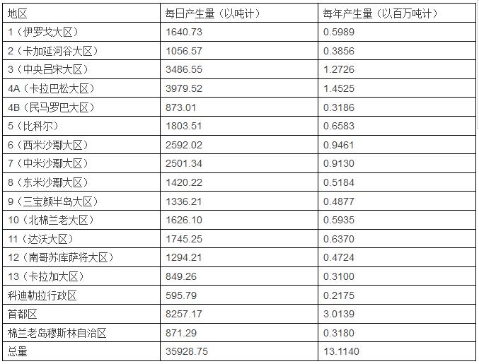 下方的圖表展示的是菲律賓全國各地區(qū)的廢物產(chǎn)生量,數(shù)據(jù)的來源是國家固廢管理委員會秘書處。數(shù)據(jù)是通過計(jì)算各地區(qū)人均廢物產(chǎn)生量和人口的乘積得到的。平均來說,在城市區(qū)域和農(nóng)村區(qū)域,人均廢物產(chǎn)生量分別為0.5kg/天和0.3千克/天。在首都區(qū),也就是馬尼拉大都市區(qū)的所在地,人均廢物產(chǎn)生量最高,為0.71千克/人/天。